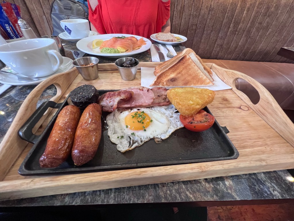 Our room wasn’t ready when we arrived at our hotel, so we headed up the street for an Irish breakfast…which is basically a big plate full of protein: Irish sausage, bacon, black and white pudding, egg, tomato, hash brown, baked beans, mushrooms, and toast.