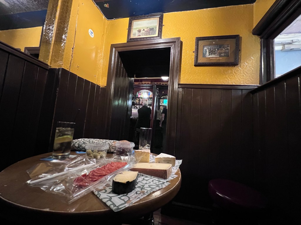 So we got a bunch of Irish cheeses, some bread, some salami, and took the whole spread to the non-food pub, with the blessings, of course, from the bartenders…and we found a cute little nook of our own, and the guys came in to share in the brilliance of our tabletop charcuterie. When we were finished, knowing that we couldn’t possibly take cheese home with us tomorrow, we offered the guys all the stuff we couldn’t finish and they happily accepted, being big fans of the well-reputed cheese shop themselves.