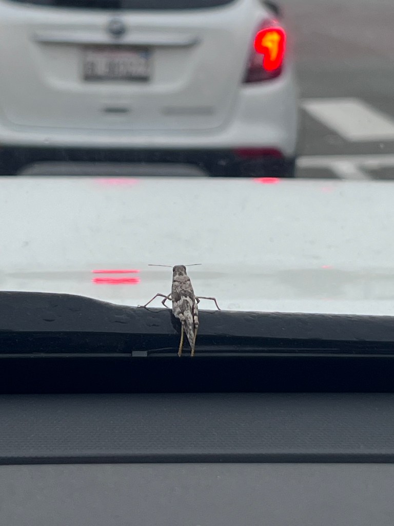 And as I’m driving slowly down the hill, past the roadworkers, something fluttered and landed on my windshield. I thought it was a leaf or a feather until I stopped at the signal and it readjusted itself. It was a grasshopper.