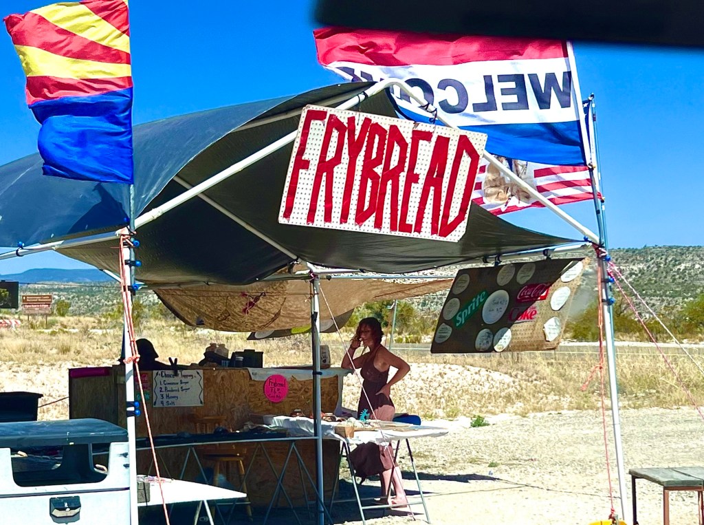 On the way out we saw a guy making fry bread in 100 degree heat…with the wind blowing like crazy. We had to stop and sample 😎