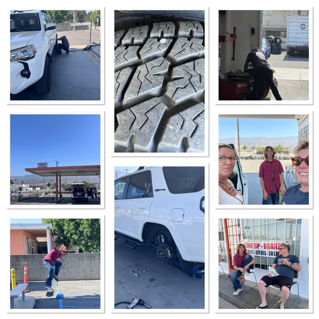 And I learned that a nail in your tire might last 100 miles before the tire blows…and I do have to remove it and it does need to be fixed right now…it shoulda been fixed before we left. And then I had a vision of us standing on the side of a road in the middle of the desert in 115 degree weather waiting for AAA because I don’t love the idea of an inconvenient trip in the wrong direction down into San Bernadino to fix a tire…and I was like, This tire must be fixed before anything else period.