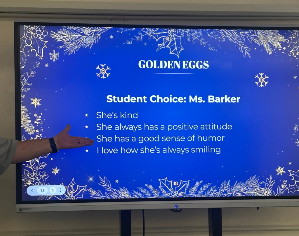 Worried it might be an emergency, I got up to check and was surprised to find a handful of congratulatory messages from friends and colleagues who were, at that very moment, sitting in the monthly staff meeting I was missing being home. They sent me a photo of the meeting slideshow: Our students chose me for the December “Golden Egg”, an honor at our school very similar to “Employee of the Month.”