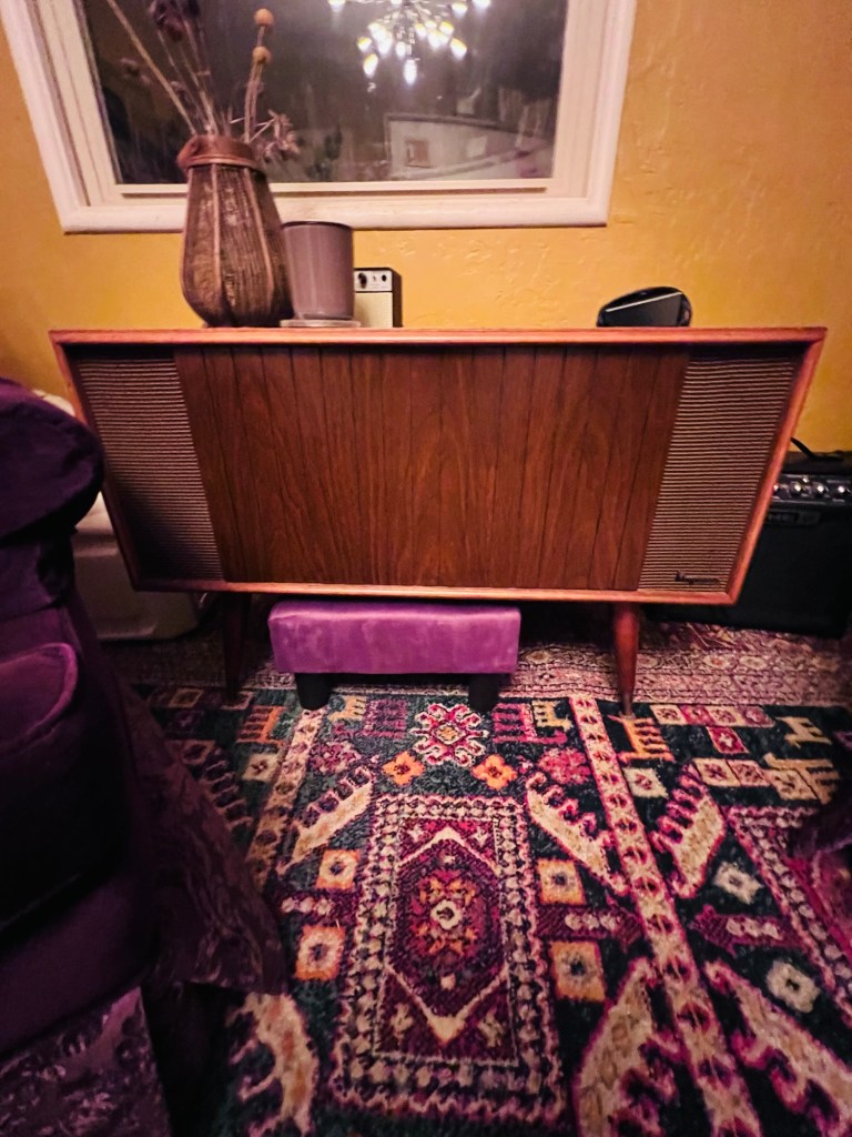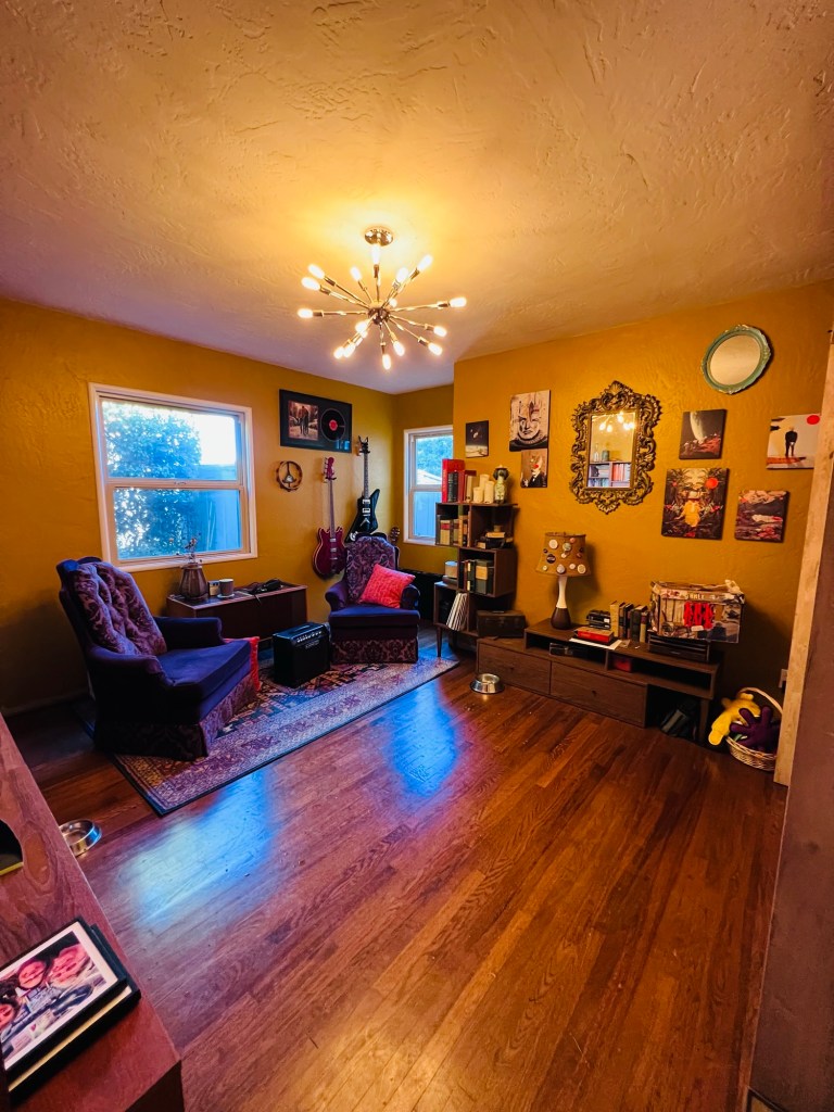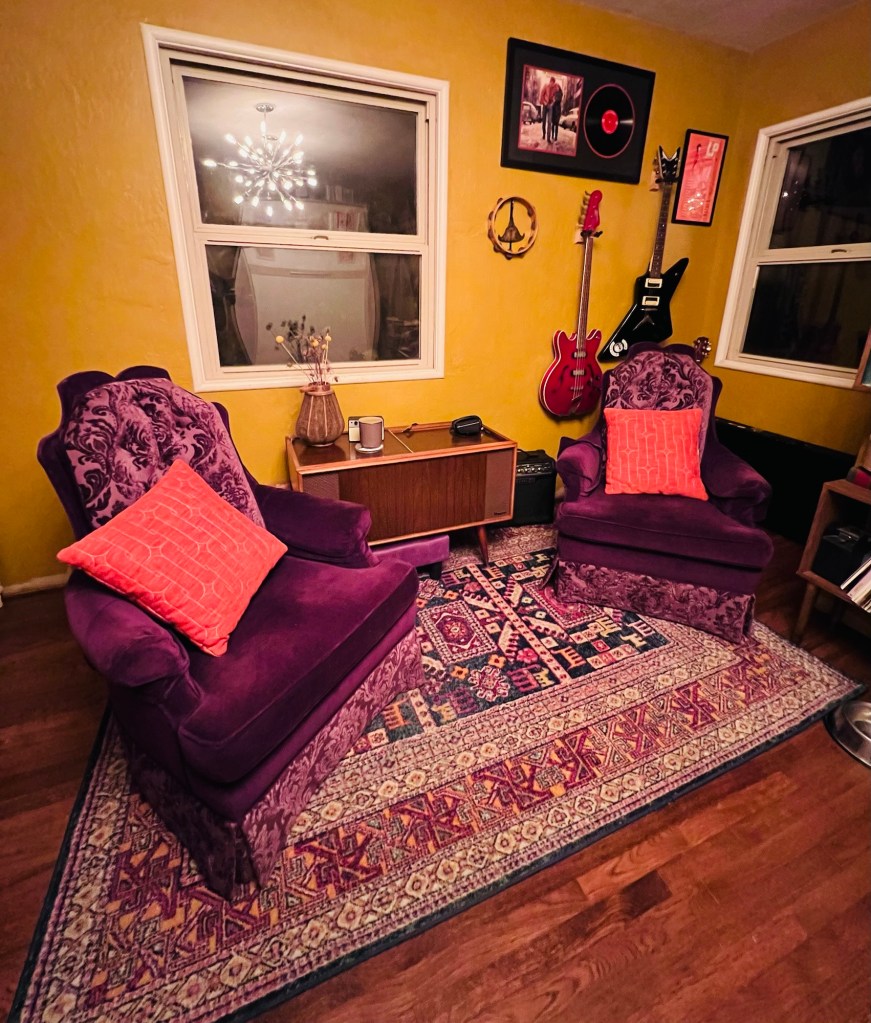And holy smokes, that once kinda empty, bland, tan room, abandoned with all those ghosts is finally feeling vibrant and exorcized! And the best part is, just like every other room in our house, every single piece of it has a story…Bob Dylan, LP, Grandma’s funky lamp, the fun chandelier, the record player, the guitars, the mirror, the books and bookcase, the posters on the wall, and those crazy cool purple chairs! We left plenty of floor space for dog beds and dancing and activities, should we feel inspired by all our new records and the kiddo’s future setlist. Let these fresh new memories start jamming with the old ones!