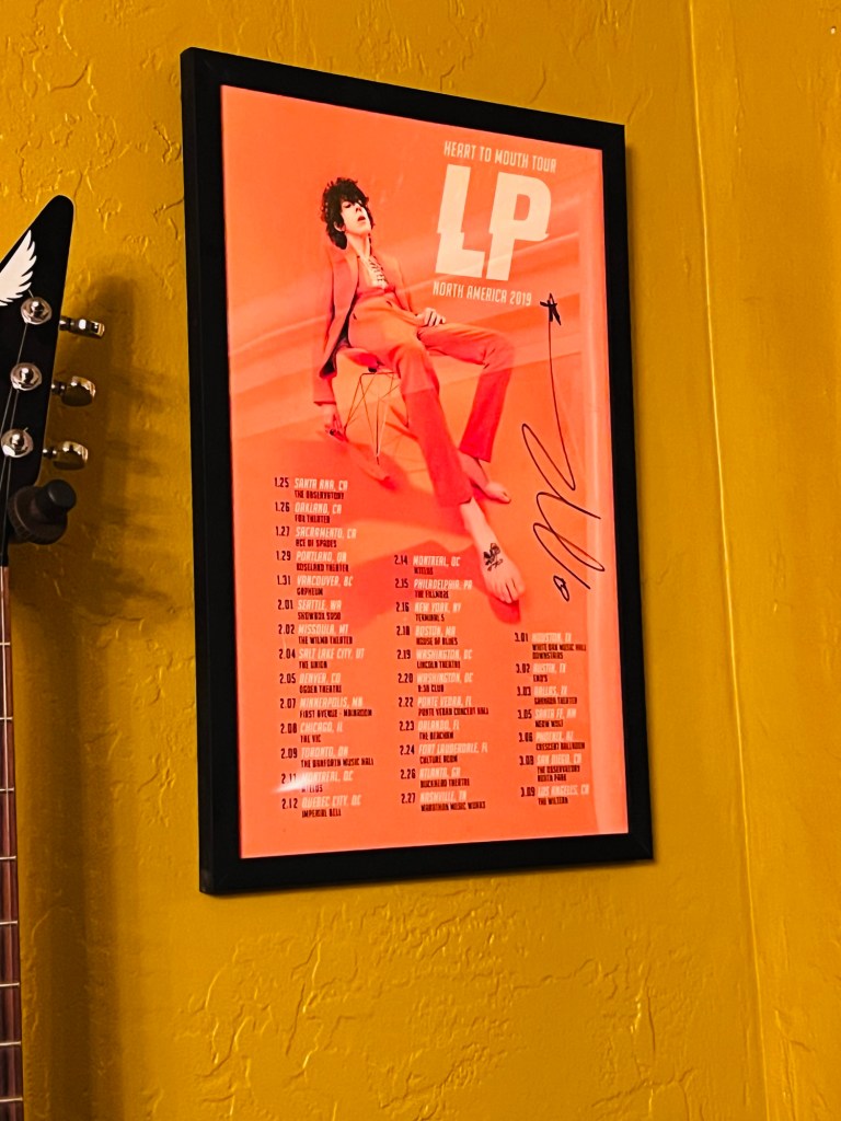 And then she pointed out the next room, mostly empty except for a mishmash of seemingly unrelated items: a Murphy bed for guests, a retro lamp from her grandparents home in Santa Barbara, a spin bike, a strand of Himalayan prayer flags on the beige walls, an old “dog” couch, a framed Bob Dylan album, a big ass Ikea picture of a lonely bridge…and, oddly, an autographed poster of this chick LP I used to know as a NYC bartender at Henrietta Hudson’s, my frequented lesbian watering hole from 2002-2005.