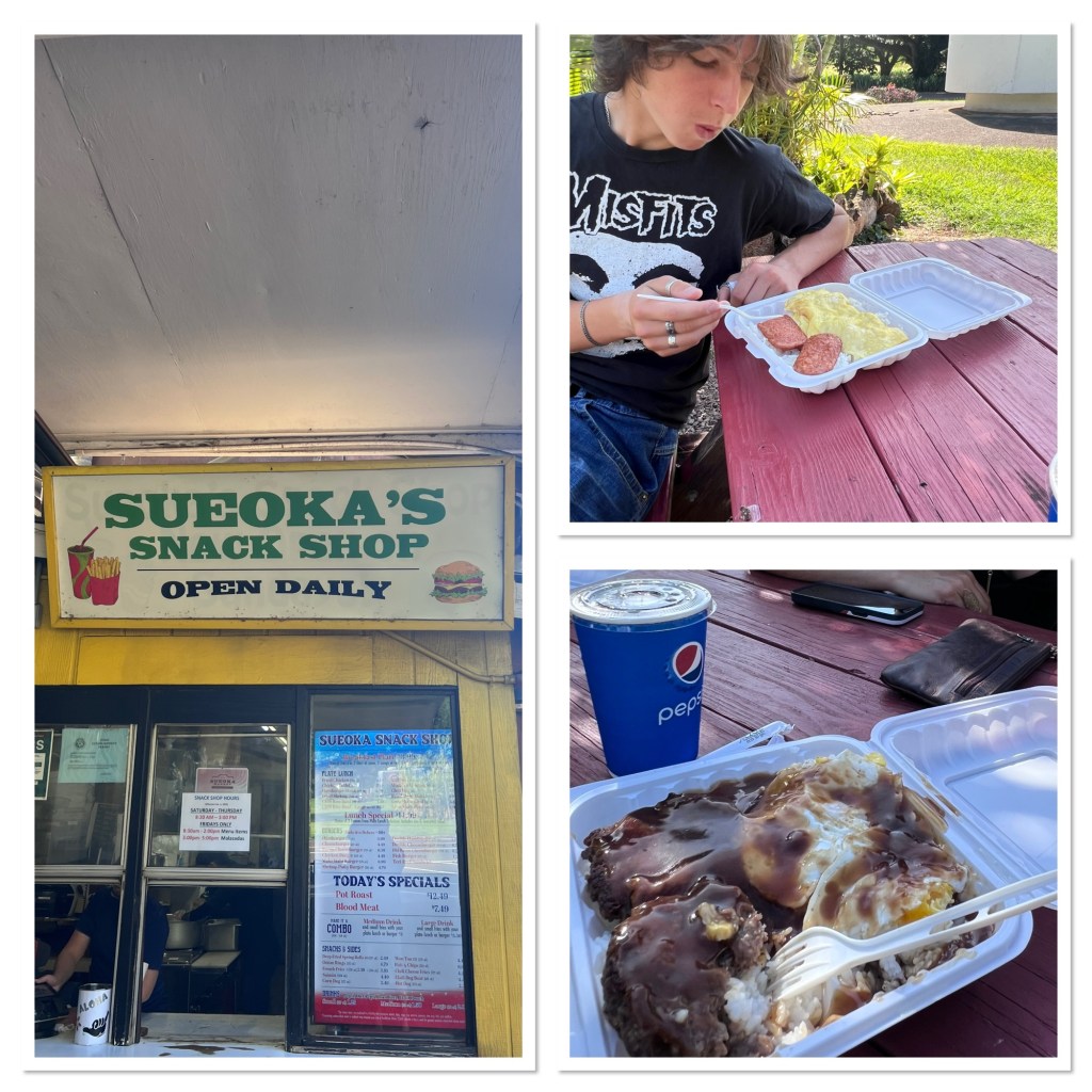In the morning, hunger and curiosity lured us into Old Koloa Town, where a simple snack shop offered Spam, eggs, and a sense of place. We found a roadside picnic table and met a squad of local chickens. The kiddo was already pacing with skater energy, using Google maps to track down spots like he had lived here in another life.