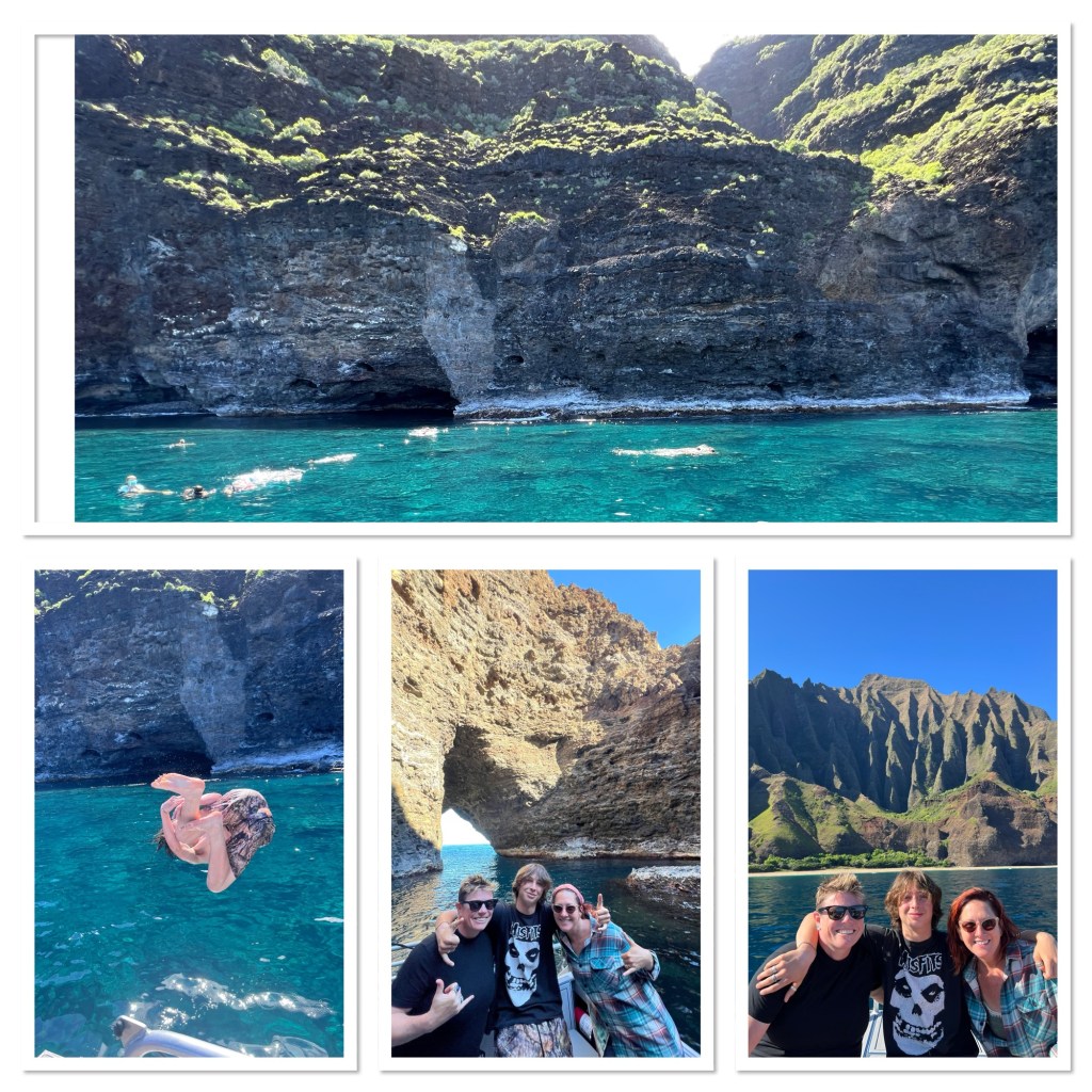 This morning began before light, with the hum of anticipation and sea air. We boarded a boat bound for the Nā Pali coast, not expecting to be stunned again, and yet—dolphins, sea caves, beaches only reachable by water. The kiddo flipped off the boat when we stopped to snorkel. We sampled real poi, not luau poi and fresh pineapple with li hing powder that wrecked me in the best way.