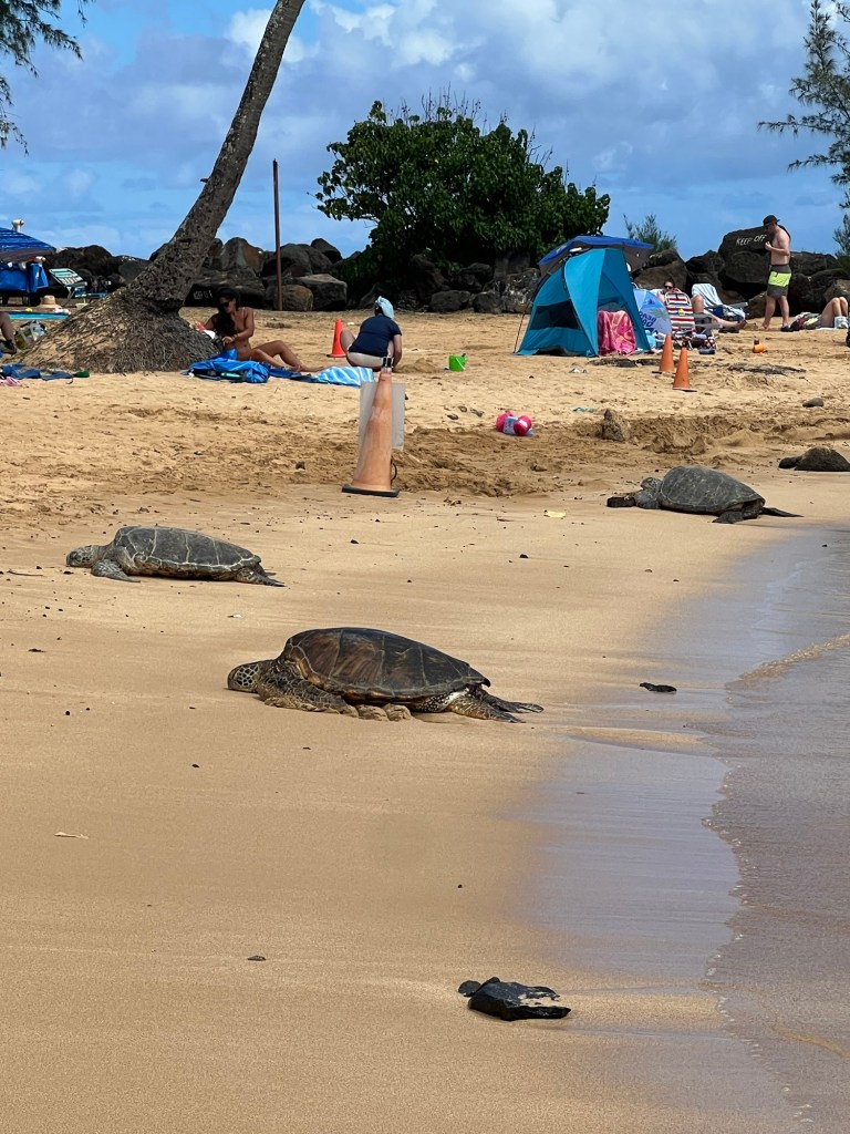 Poʻipū Beach shimmered with beauty and chaos—tourists climbing over sea turtles, kids throwing rocks into the ocean, shameless selfies in sacred places. It reminded us a little of The Children’s Pool in La Jolla, of how people forget that wonder deserves reverence. We agreed the vibe was a little off, so we didn’t stay long.